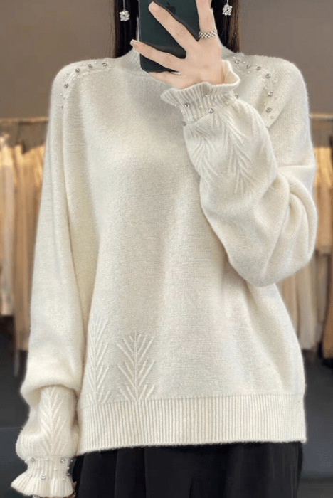 ふんわりと柔らかな質感とプリンセススリーブがボリューム感を出しすぎず、程よく立体感を出してくれます♪肩から袖にかけてあしらわれた輝くビジューとパールが、華やかで女性らしいアクセントをプラス◎柔らかなニットのハイネックデザインで首元をすっきり見せ、フェミニンな印象をさらにアップ!スカートやパンツとの相性も抜群で、オン・オフ問わず活躍する一着です。デートや特別なシーンにはもちろん、日常使いにもぴったりな華やかアイテムです。