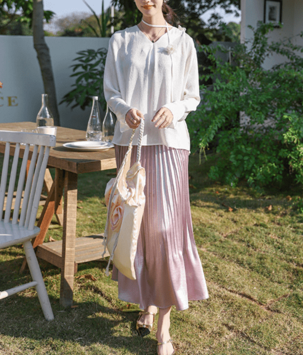 光沢感のある上品な素材が動くたびにニュアンスを生み、華やかながらも軽やかな印象に。