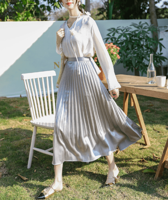 ふんわり軽やかに揺れるプリーツが、骨格ウェーブさんの下半身のボリュームを自然に和らげながら、エレガントな印象を演出するロングスカート。繊細なプリーツが縦ラインを強調し、スラリとしたシルエットへと導きます。ウエストは程よいフィット感があり、腰位置を高く見せることで脚長効果も◎。