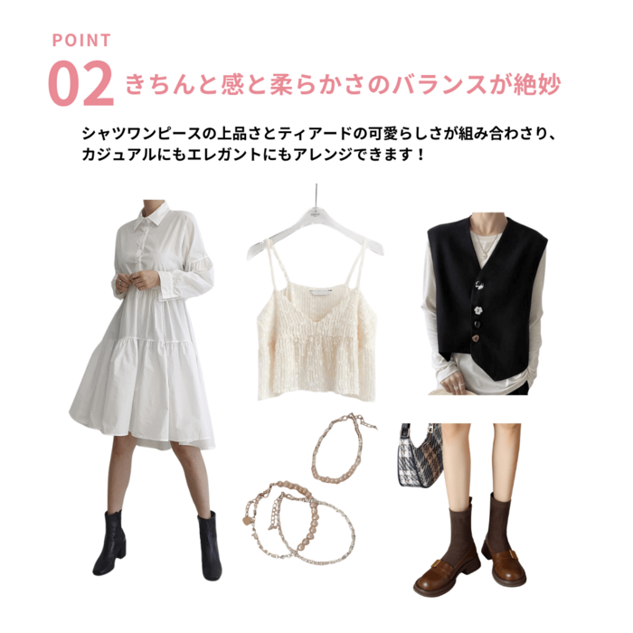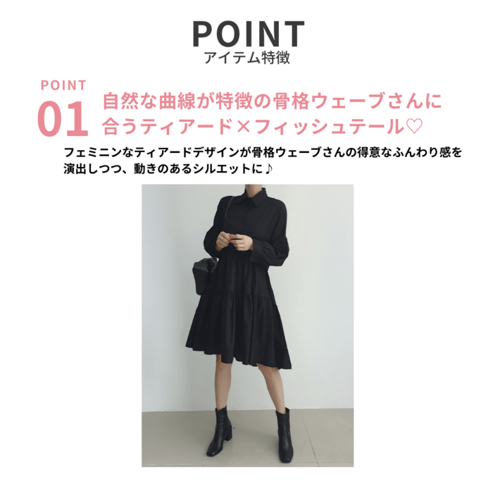 フェミニンなティアードデザインと動きのあるフィッシュテールシルエットが特徴のワンピース♪骨格ウェーブさんが得意なふんわりとしたラインを活かしながら、下半身のボリュームをカバーしつつ軽やかな印象に。シャツワンピースのきちんと感とティアードの柔らかさが絶妙にマッチし、カジュアルにもエレガントにも着こなせます。ウエストをベルトでマークすれば、さらにメリハリのあるシルエットに。デイリーからお出かけまで、幅広いシーンで活躍する一着です。