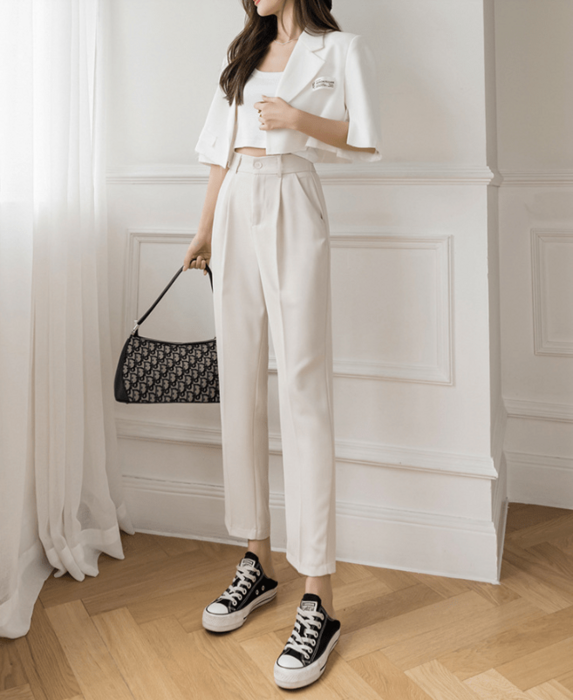 脚のラインをすっきり見せるセンタープレス入りのシガレットパンツ。ハイウエストデザインが腰の位置を高く見せ、自然にスタイルアップを叶えます!柔らかめの素材を選ぶことで、骨格ウェーブさんが苦手なハリ感を抑え、しなやかにフィット。トップスをインすれば、さらにバランスの良いシルエットに仕上がります。オンオフ問わず活躍する万能アイテム。