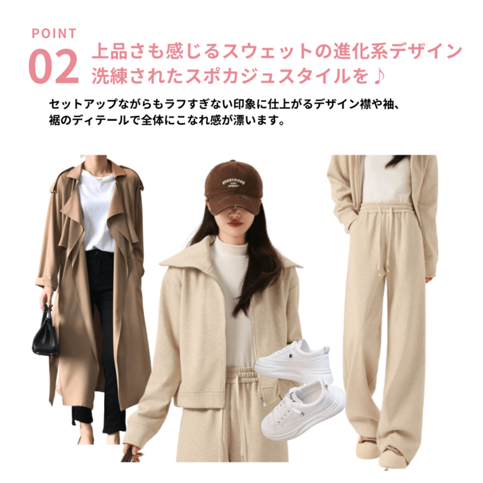 トレンド感のあるワイドカラーデザインが特徴のスウェットセットアップ。骨格ウェーブさんが苦手としがちなカジュアルスタイルも、コンパクトな丈感のトップスとハイウエストのワイドパンツで、すっきりバランスよく着こなせます。大きめの襟が上半身に立体感をプラスし、顔まわりを華やかに見せてくれるのも嬉しいポイント。セットでの着用はもちろん、単品でも着回しやすく、リラックス感とスタイルアップを両立できる一着です。