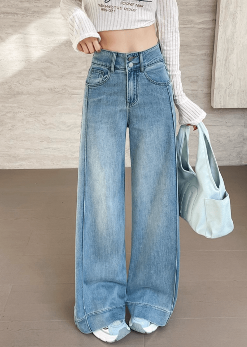 ダブルボタン仕様で視線を上に引き上げ、低く見えがちなウエスト位置をカバー◎サイド切り替えステッチが縦ラインを強調し、脚全体をすっきり長く見せてくれます。裾広がりのフレアシルエットが太ももまわりを拾わず、下半身のボリューム感も自然にカバー。トレンド感と体型カバーを両立した優秀デニムです!