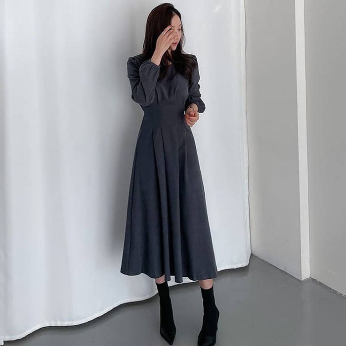 骨格ウェーブさんが最大限スタイルアップするロングワンピース。腰の高い位置にウエストマークがあるのでしっかりと目線を上げてくれ、骨格ウェーブさんの重心UPコーデが完成します。