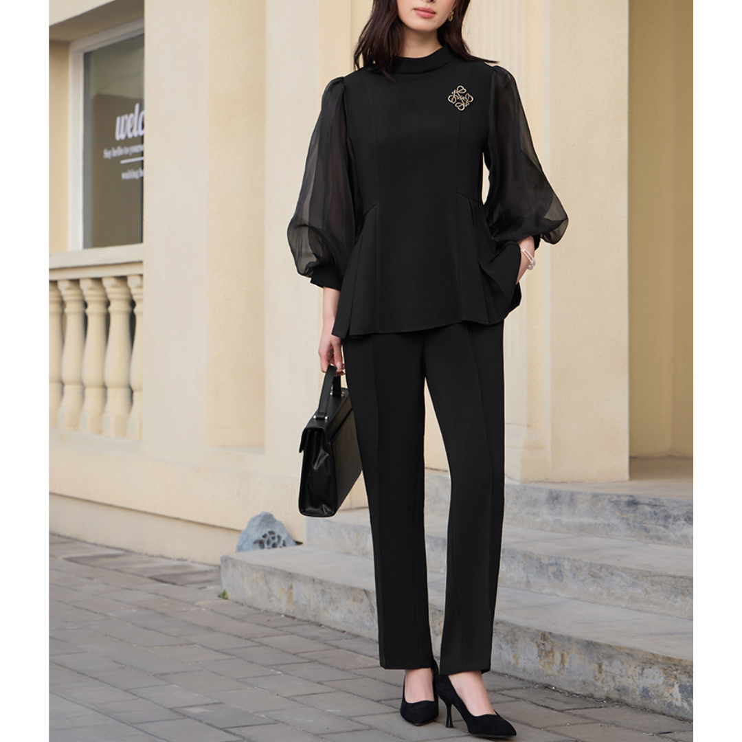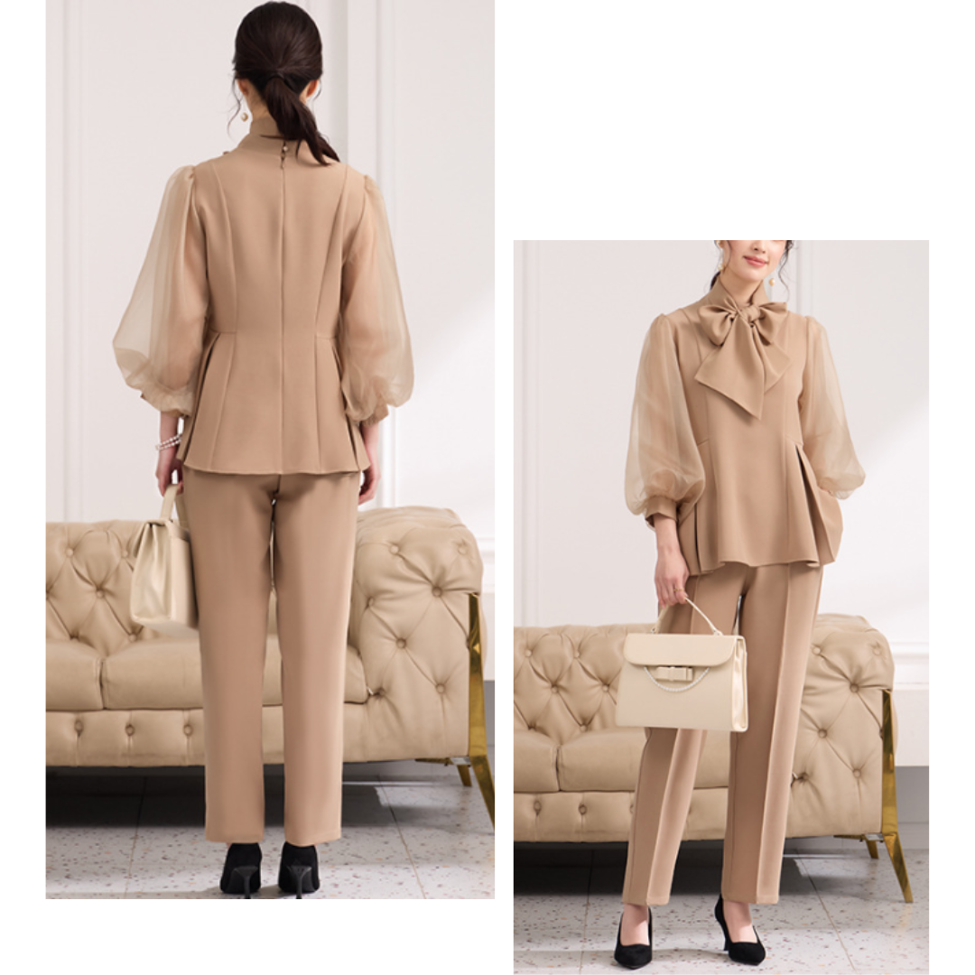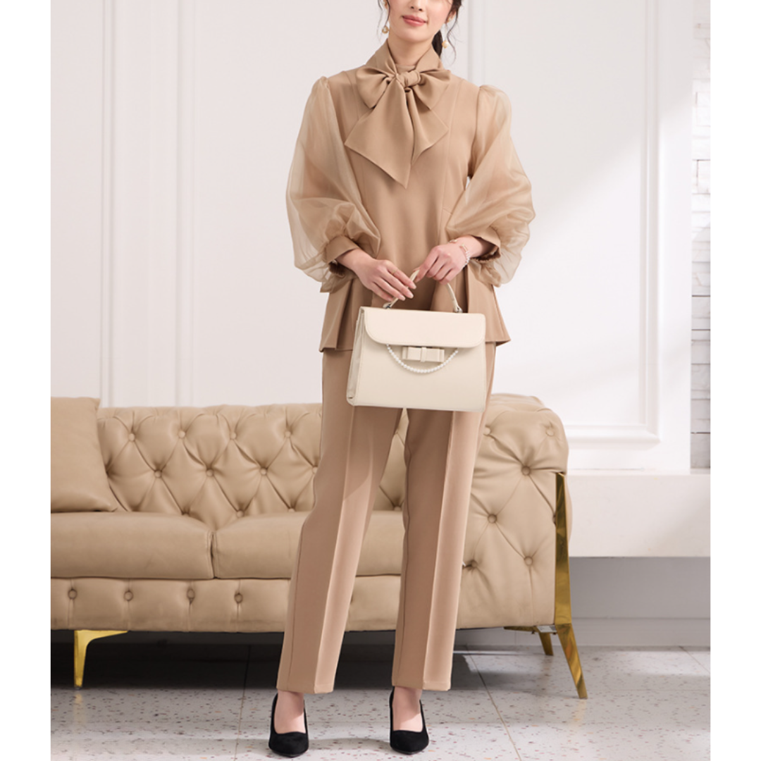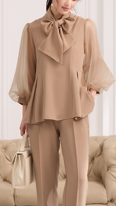 骨格ウェーブさんの上半身に足し算で華やかさをプラスする、ランタンスリーブ×ボウタイのパンツスーツ。シアーな袖のふくらみが自然に立体感を生み、上半身の薄さをカバー。ペプラム風のウエストデザインで、くびれを引き立てながら腰の位置を高く見せてくれます。パンツスタイルでもフェミニンな雰囲気を保ち、セレモニーからきれいめオフィスコーデまで幅広く活躍。ネックレスやイヤリングでさらに視線を上に集めるのもおすすめです。