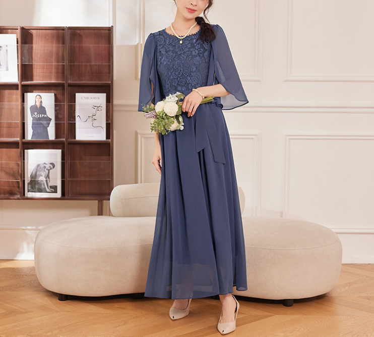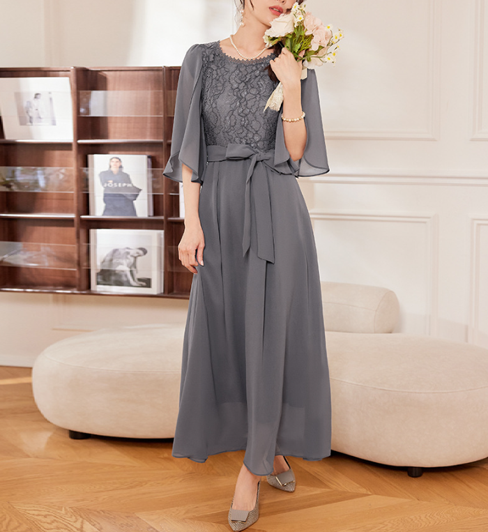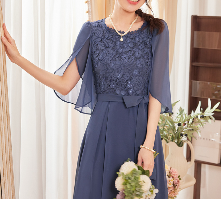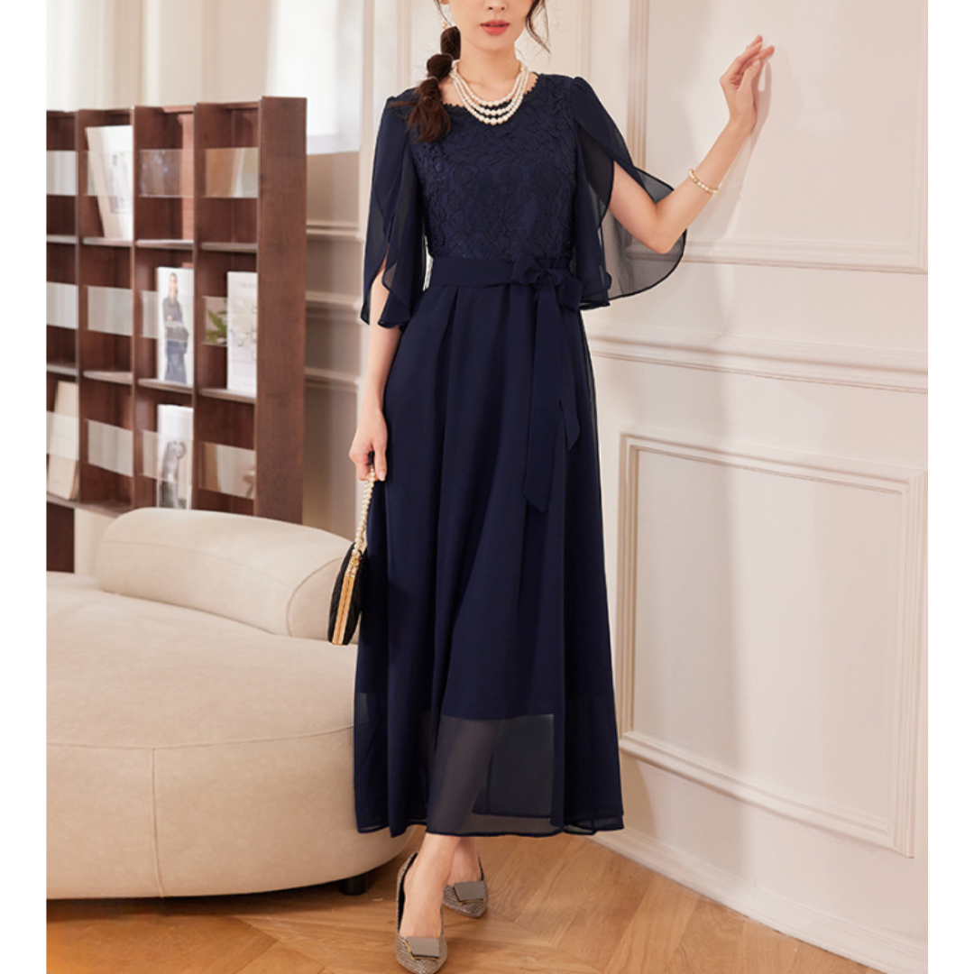 華やかなレースと軽やかなケープ袖が上半身に程よいボリュームを与え、骨格ウェーブさんの華奢さを引き立てるロングワンピース。しなやかな落ち感のある素材が体に優しく沿い、柔らかく女性らしい印象に仕上げてくれます。高めのウエスト切替で重心が上がり、スタイルアップ効果も◎。ケープ風の七分袖は二の腕をふんわりカバーしつつ、エレガントでフォーマルなシーンにも映えるバランスに。結婚式やパーティーなど、特別な日にぴったりの一枚です。