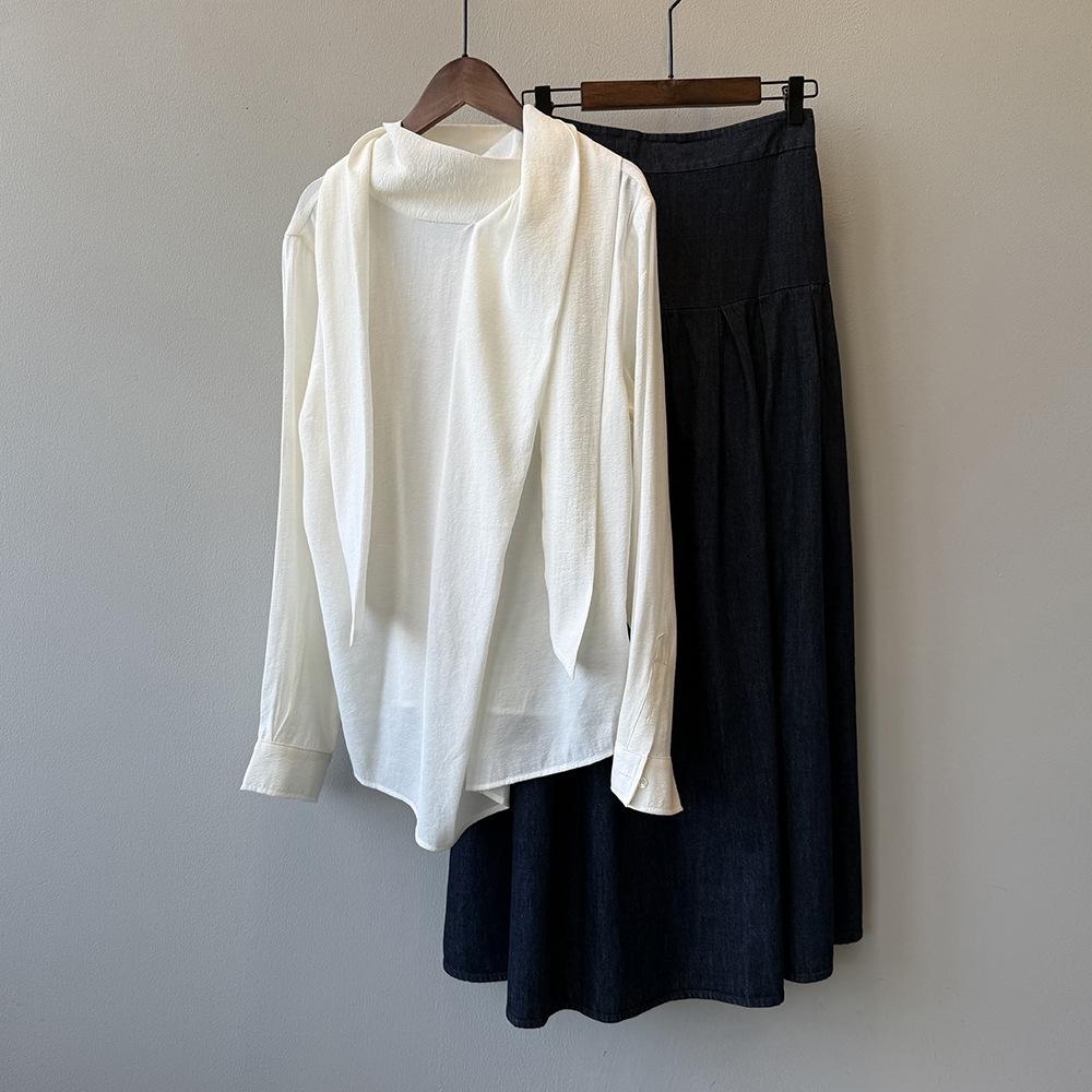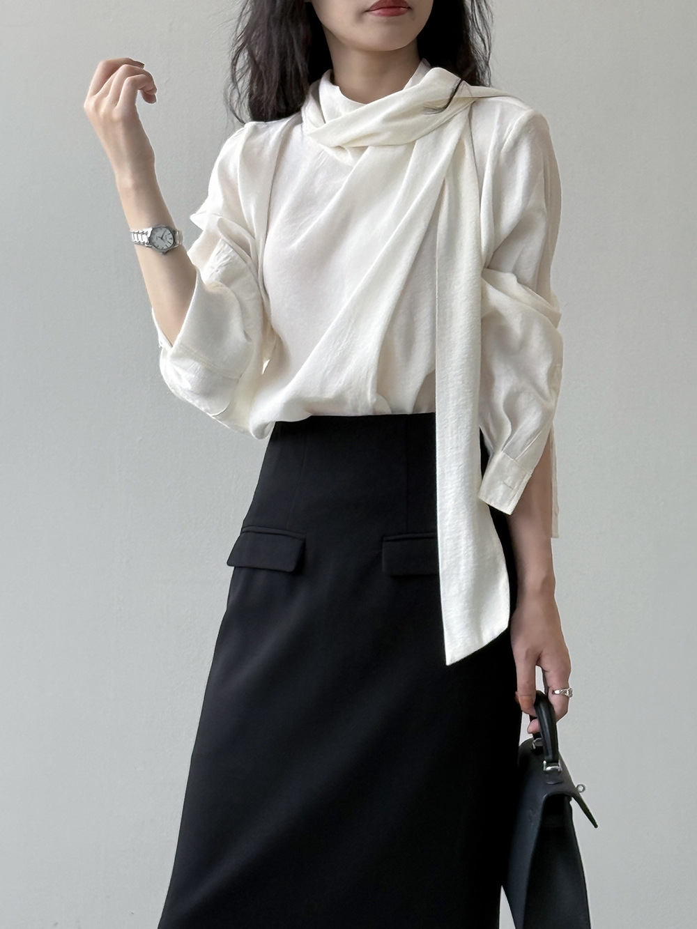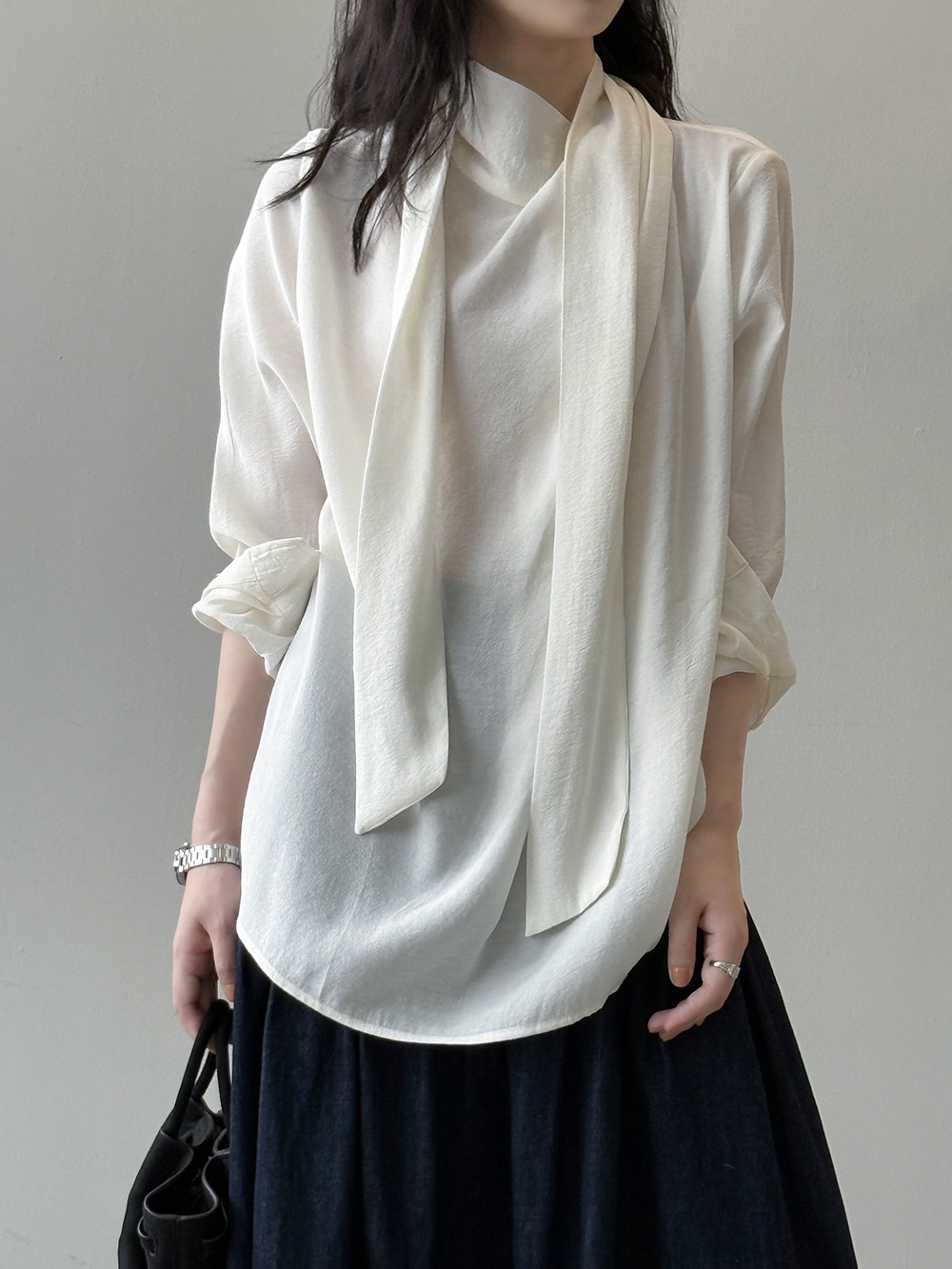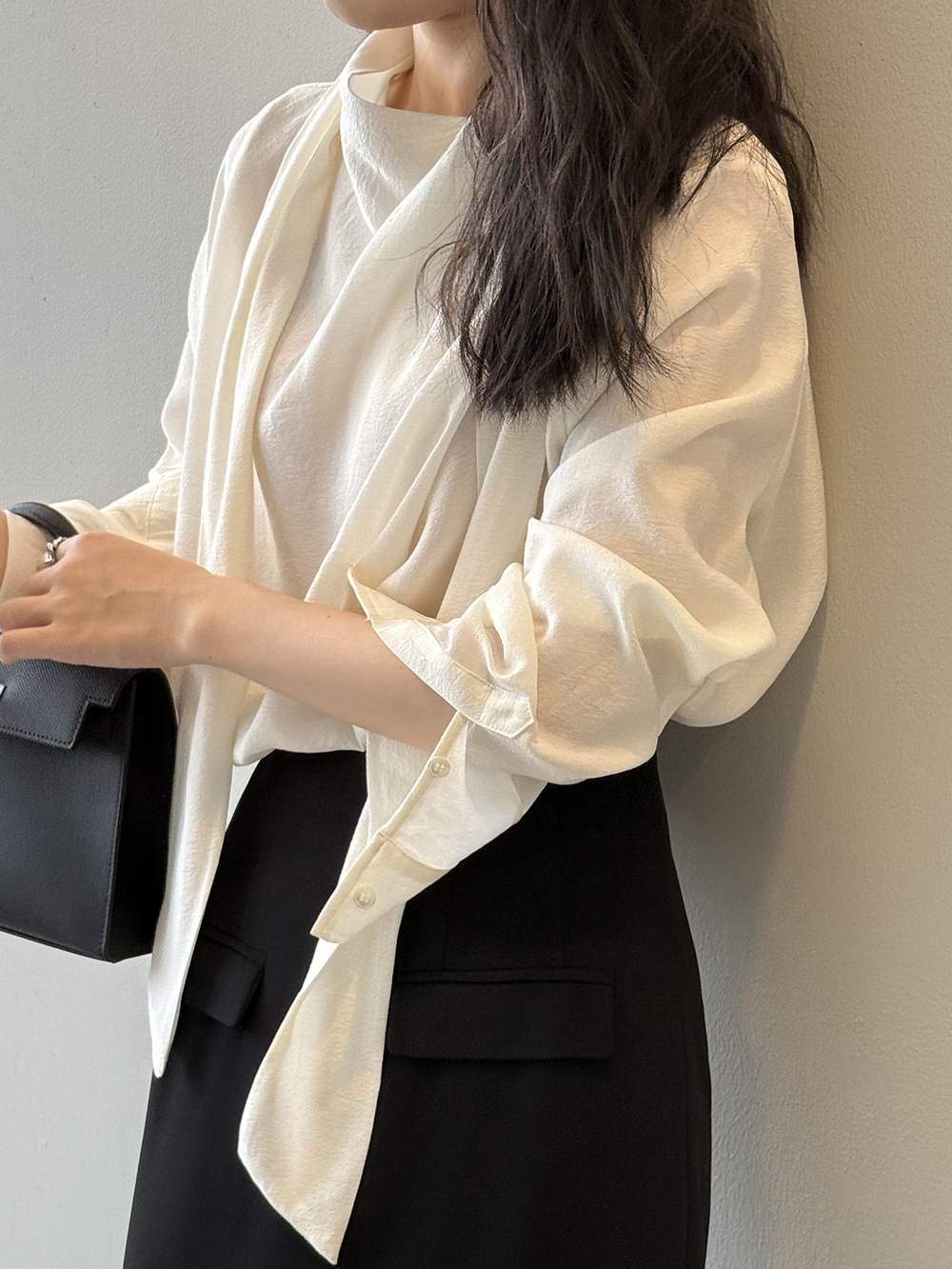 上品な抜け感と女性らしさを兼ね備えた、アレンジ自在のボウタイ付きブラウス。柔らかく落ち感のある素材が骨格ウェーブさんの華奢な体型に馴染みやすく、首元のボウタイが視線を上に引き上げてバランスアップを叶えてくれます。フロントで結んだり垂らしたり、アレンジ次第で印象チェンジが楽しめるのも魅力。長め丈の程よいゆるさが体のラインを拾いすぎず、スカートにもパンツにも合わせやすい万能な一着です。