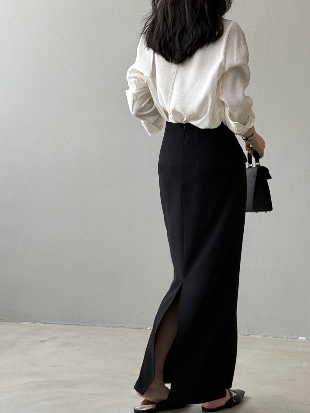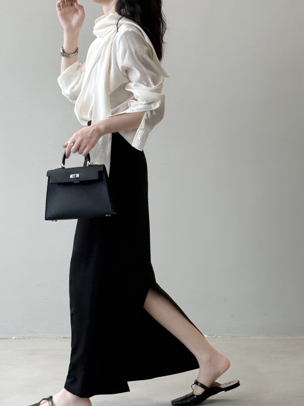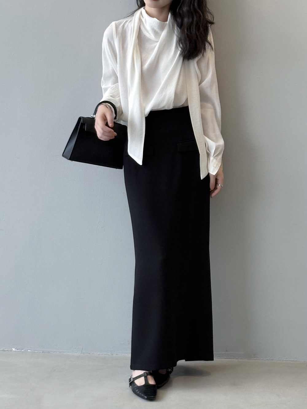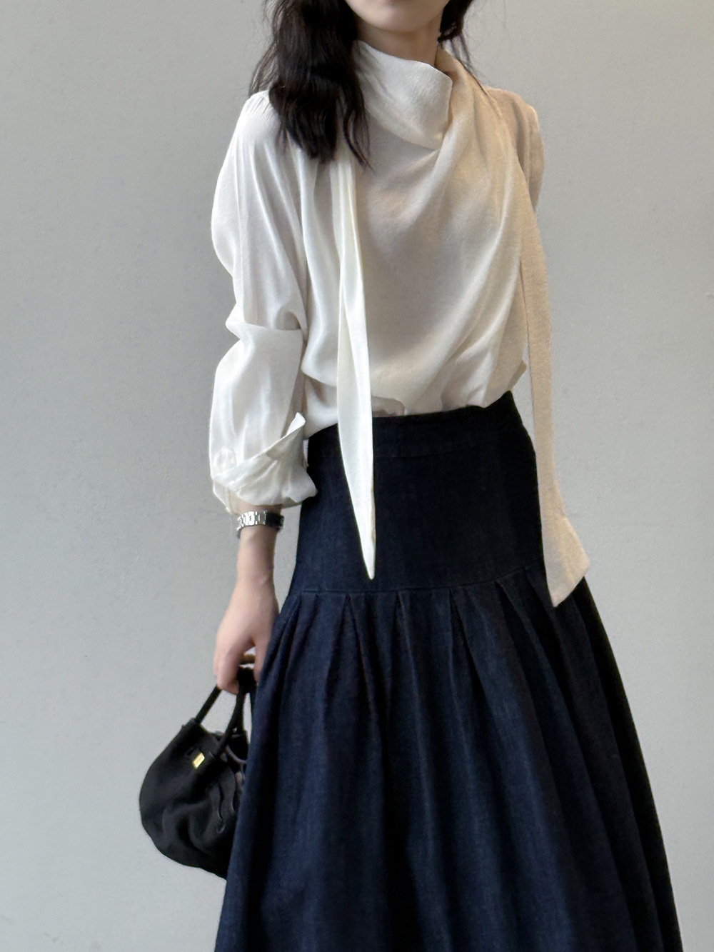 上品な抜け感と女性らしさを兼ね備えた、アレンジ自在のボウタイ付きブラウス。柔らかく落ち感のある素材が骨格ウェーブさんの華奢な体型に馴染みやすく、首元のボウタイが視線を上に引き上げてバランスアップを叶えてくれます。フロントで結んだり垂らしたり、アレンジ次第で印象チェンジが楽しめるのも魅力。長め丈の程よいゆるさが体のラインを拾いすぎず、スカートにもパンツにも合わせやすい万能な一着です。