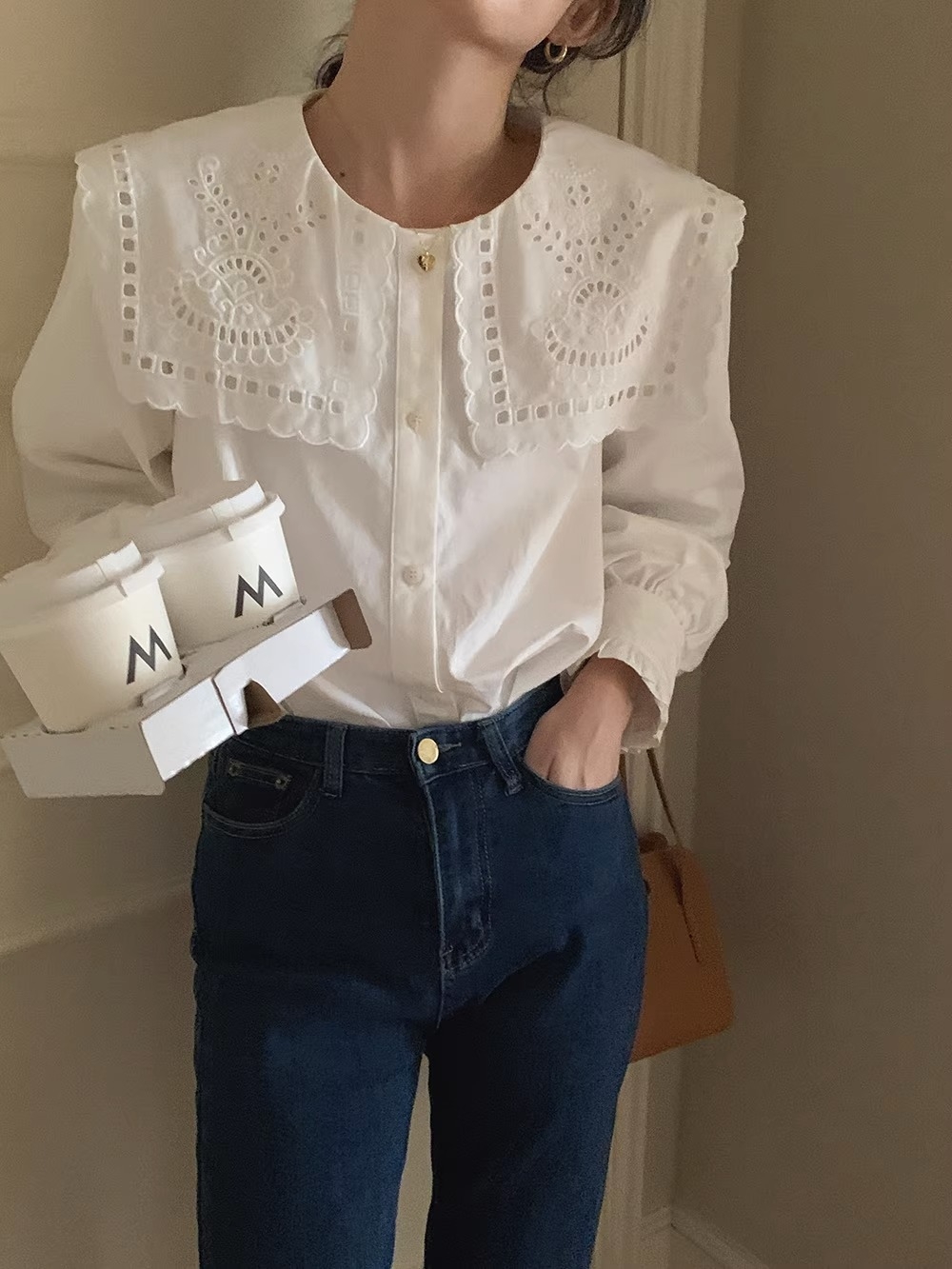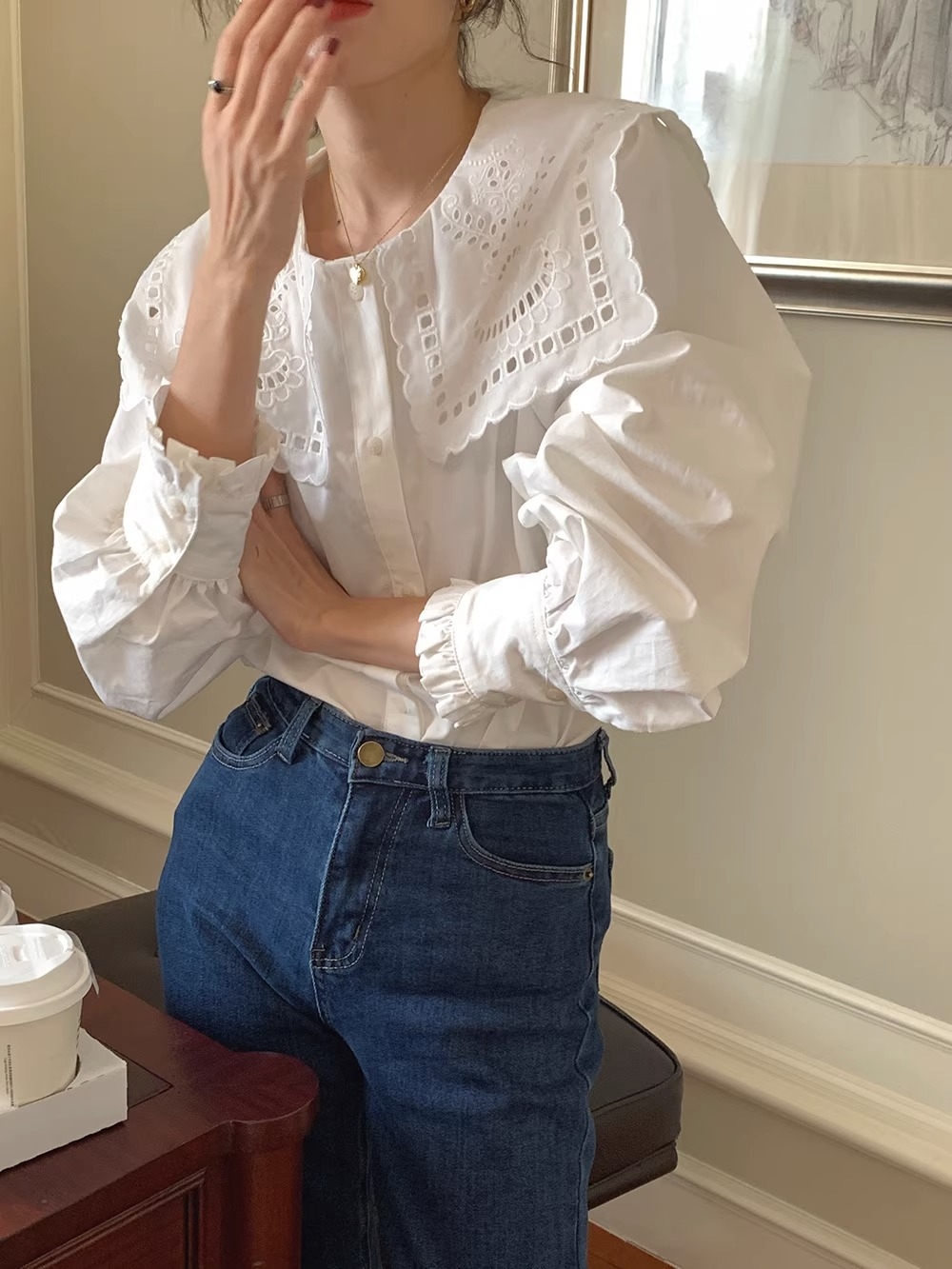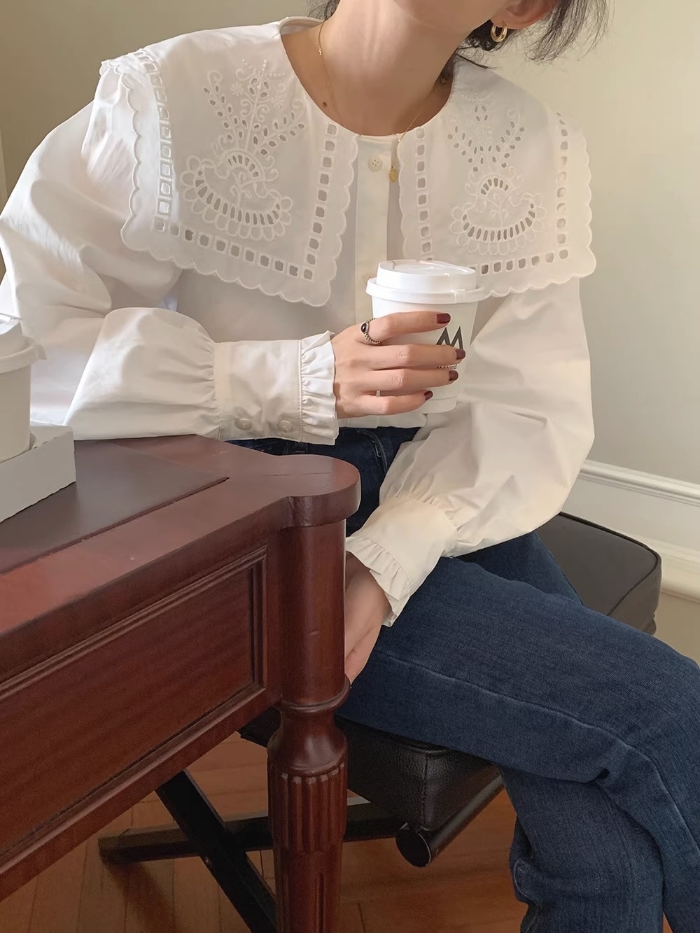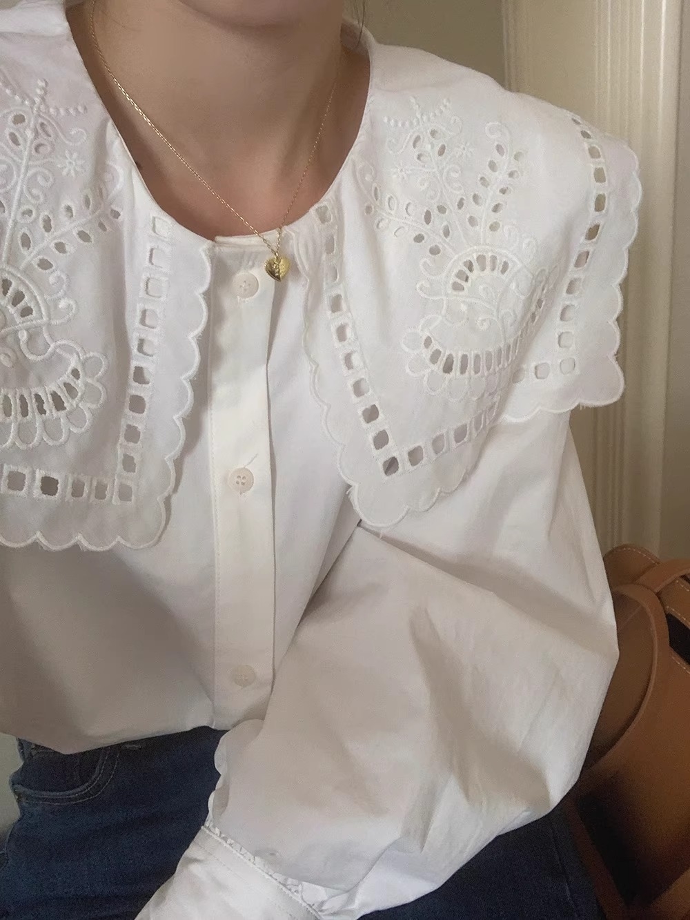 立体感のあるビッグカラーが視線を上に集め、骨格ウェーブさんの下重心バランスをさりげなくカバー。繊細なレース刺繍が華やかさを添えつつ、首まわりをすっきり見せるデザインで着こなしやすさも◎デニムやワイドパンツに合わせれば、甘すぎず大人可愛いスタイルが完成します。