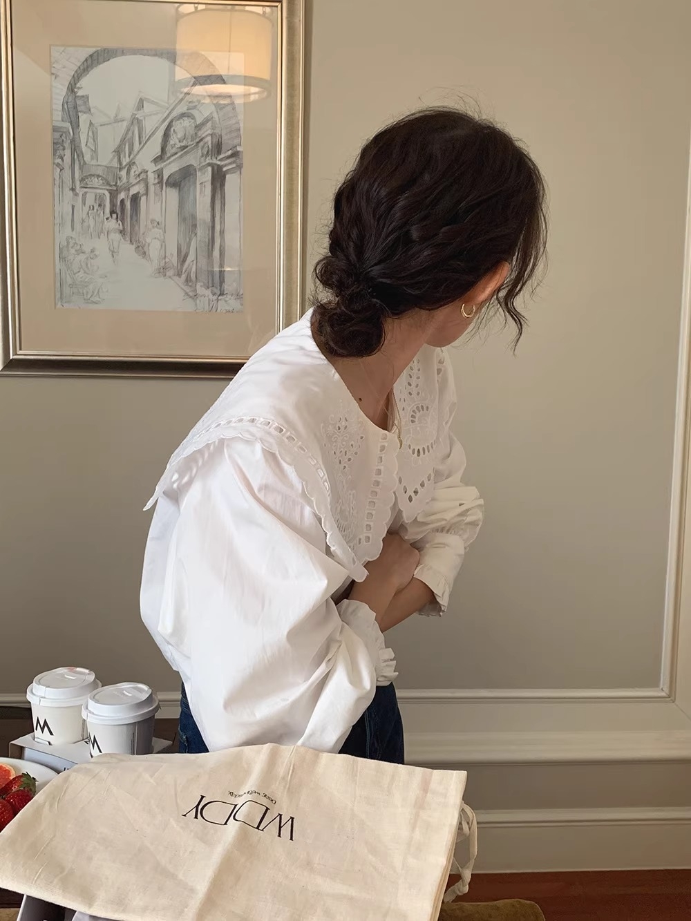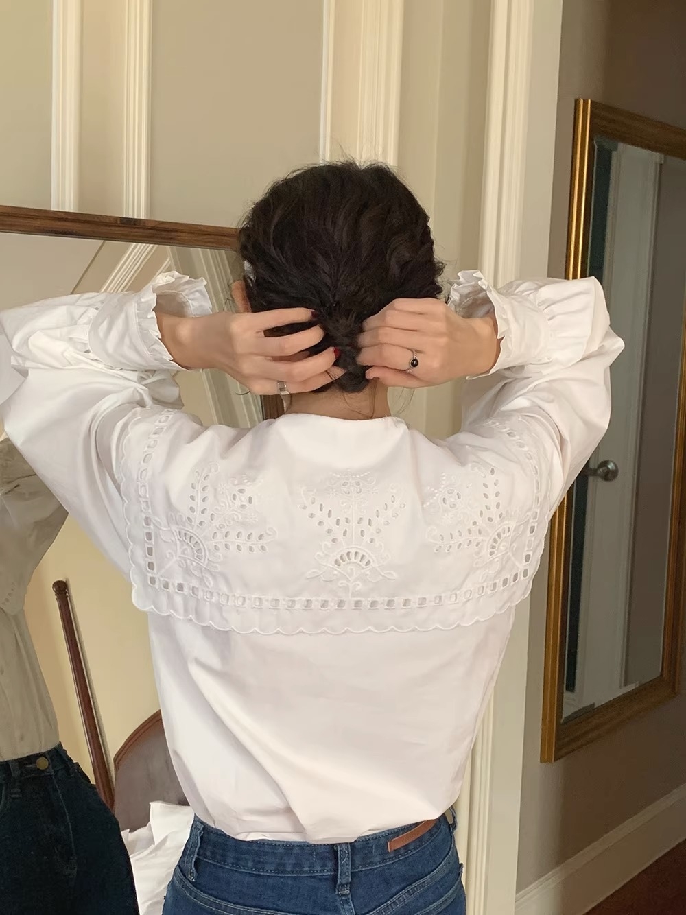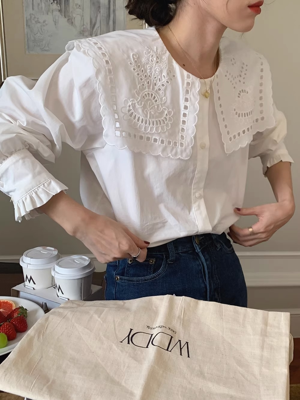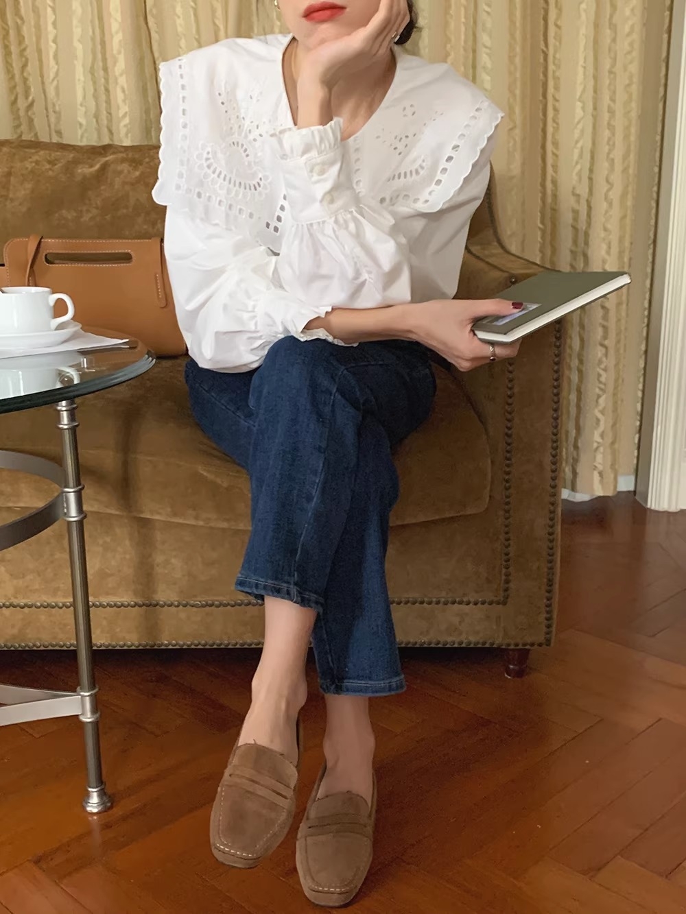 立体感のあるビッグカラーが視線を上に集め、骨格ウェーブさんの下重心バランスをさりげなくカバー。繊細なレース刺繍が華やかさを添えつつ、首まわりをすっきり見せるデザインで着こなしやすさも◎デニムやワイドパンツに合わせれば、甘すぎず大人可愛いスタイルが完成します。