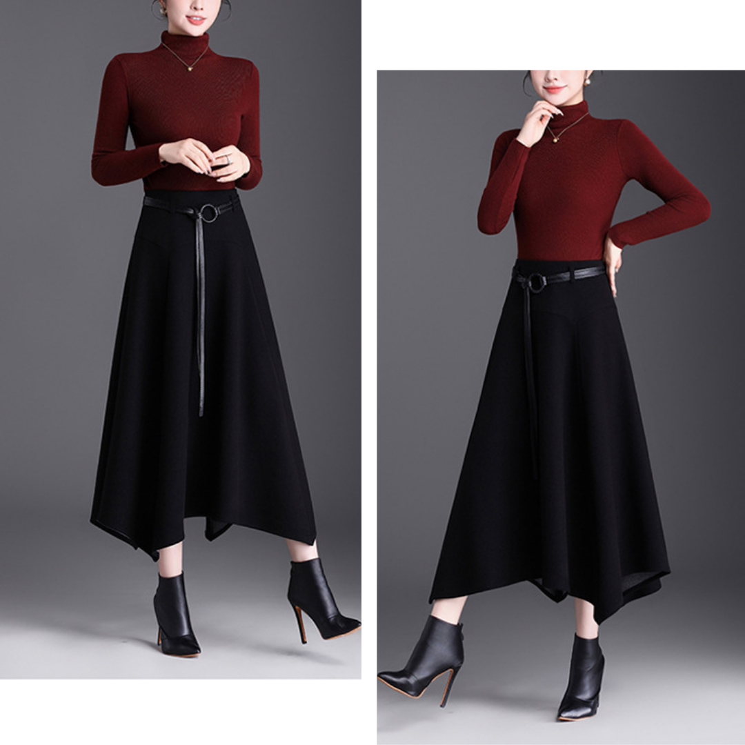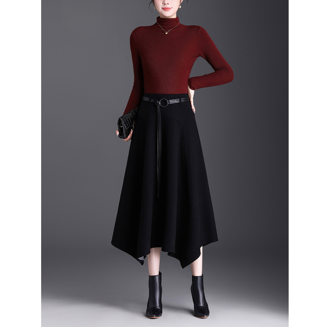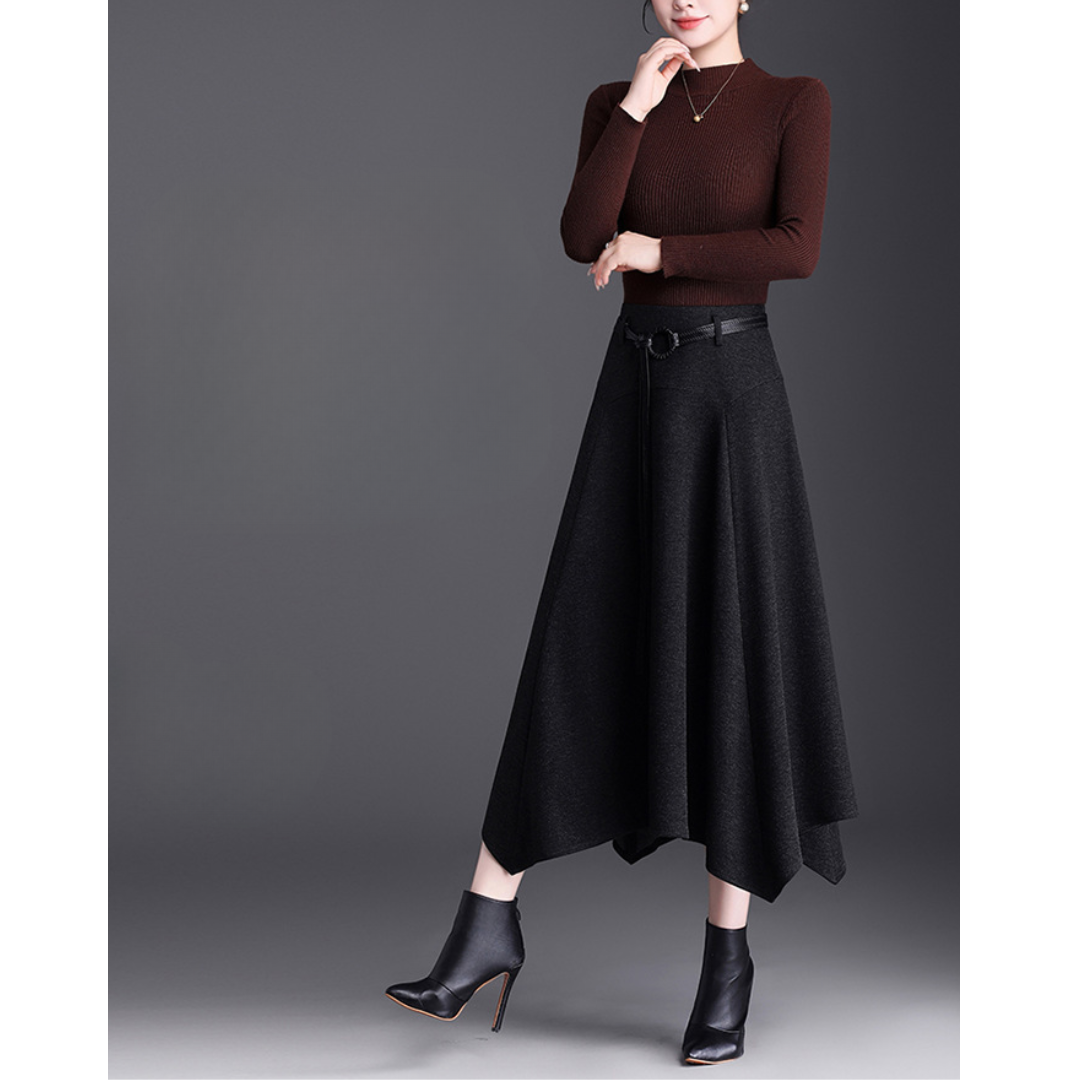 骨格ウェーブベルト付きアシンメトリーヘム ロングフレアスカート