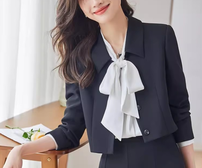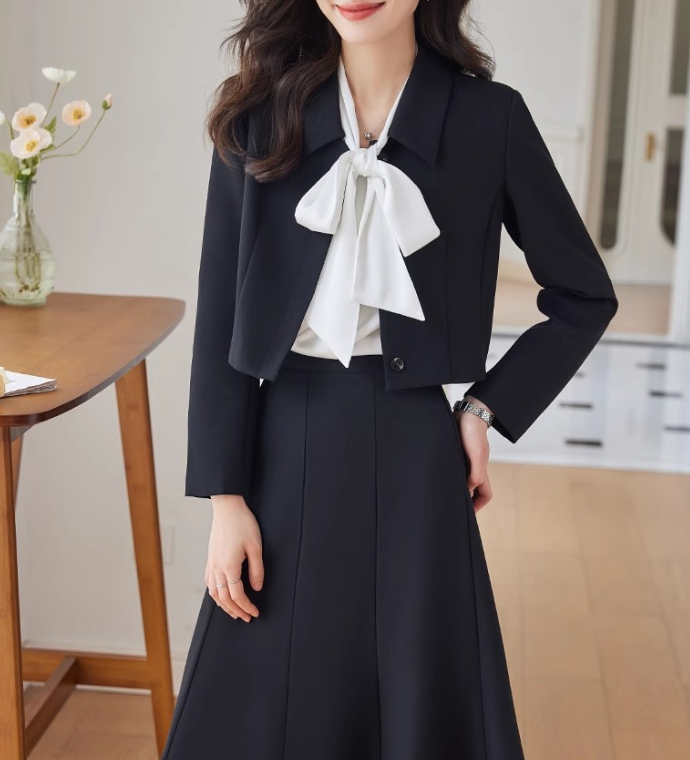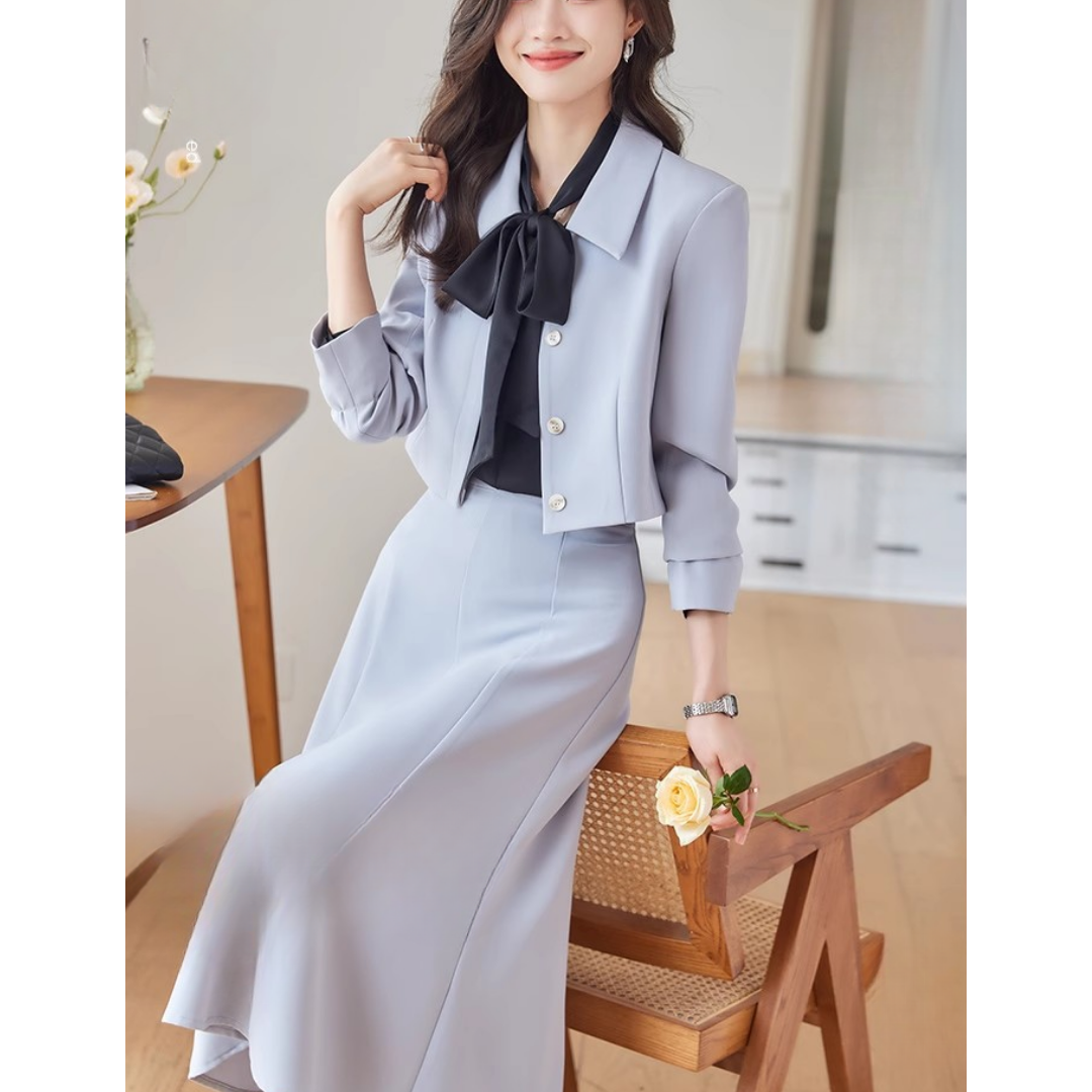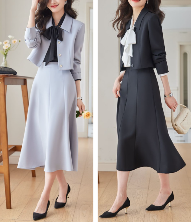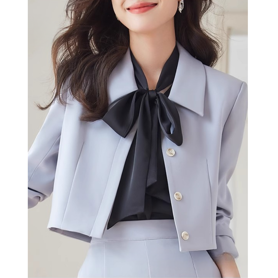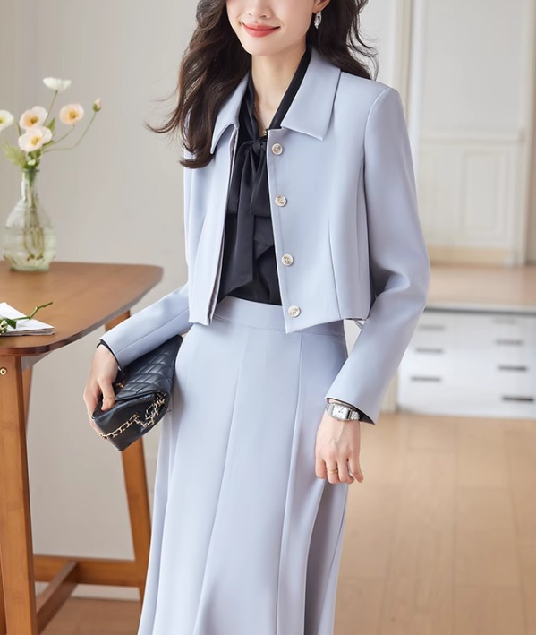 コンパクトなショート丈ジャケットとスカートのフェミニンなセットアップ。ウェーブさんの華奢な上半身を引き立て、ウエスト位置を高く見せるスカートラインでスタイルアップも叶えます。柔らかくとろみのある素材感で、上品さと着心地を両立。お仕事や特別な日にも活躍する一着です。