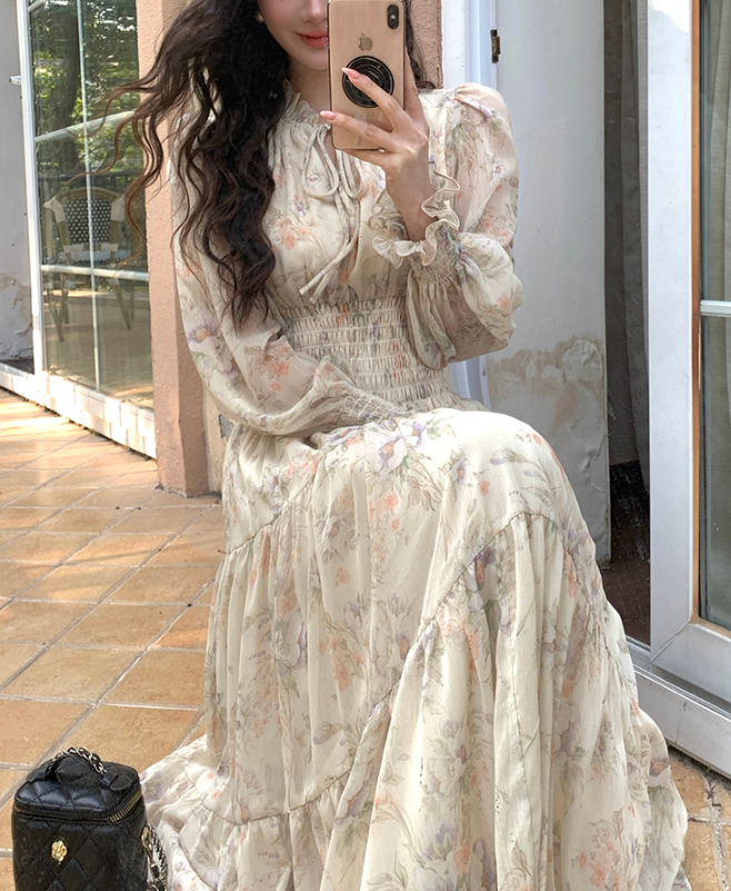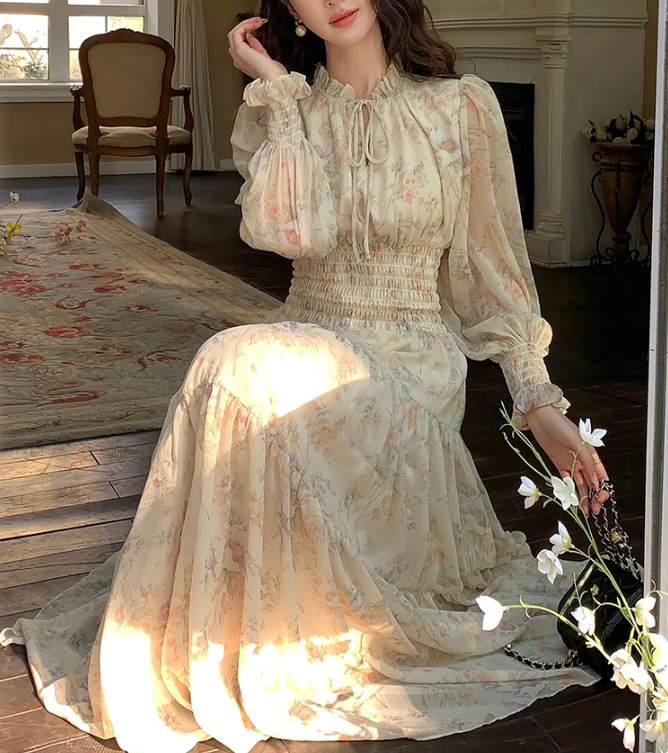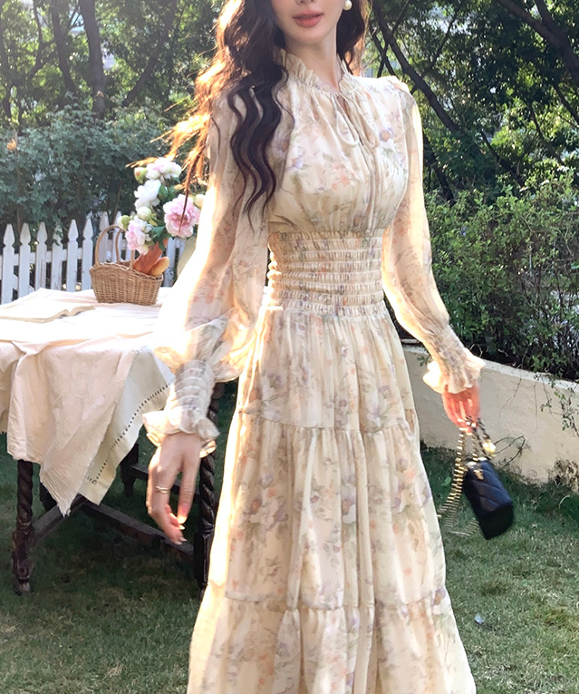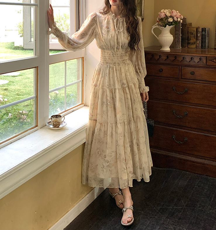 軽やかに揺れるシフォン素材と、繊細な花柄が女性らしい印象を引き立てるロングワンピース。首元に沿うスタンドカラーとウエストシャーリングが視線を上に集め、骨格ウェーブさんのバランスを整えます。高めのウエスト位置から広がるティアードシルエットが、下半身をやさしくカバーしながらスタイルアップ効果も。1枚で華やかさと上品さを兼ね備えた、特別感のある着こなしが叶うアイテムです。
