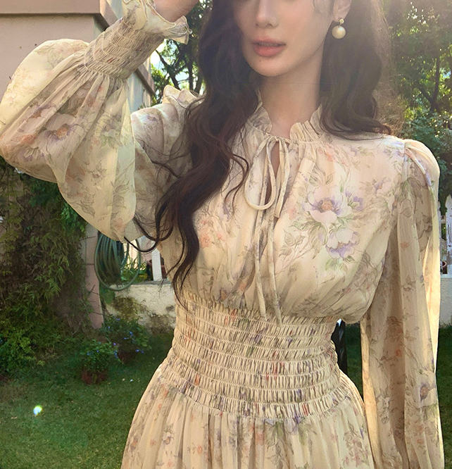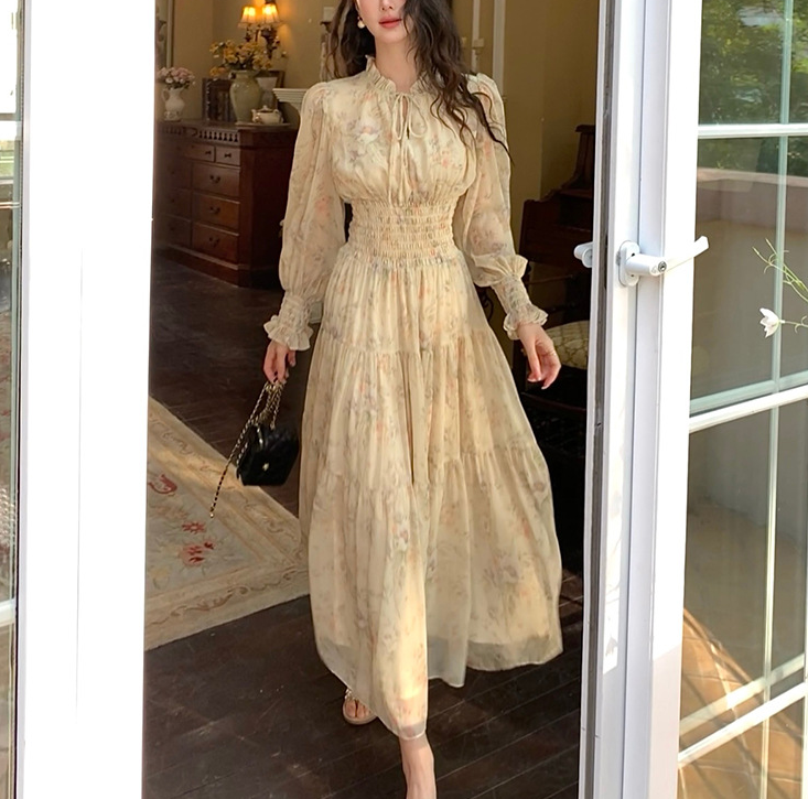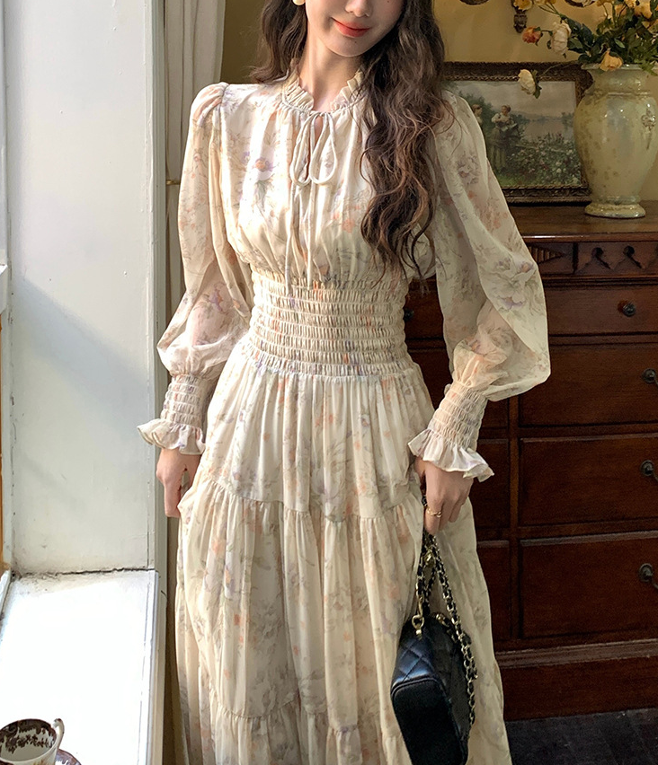 骨格ウェーブスタンドカラー花柄しシフォンワンピース