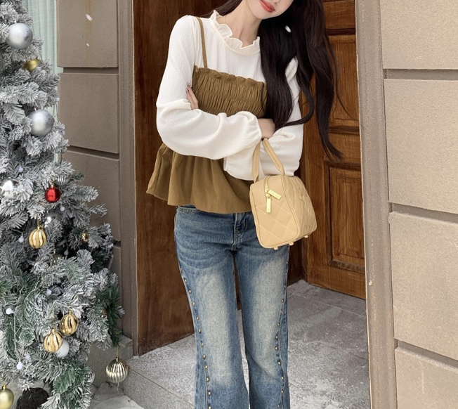 骨格ウェーブさんの上半身に程よい華やかさを添えながら、バランスよく着こなせるドッキングトップス。胸元のシャーリングデザインが視線を自然に上へ集め、コンパクトなシルエットが重心を高く見せてくれます。ふんわりと広がるペプラムラインが腰まわりをカバー。デニムやハイウエストボトムと合わせると、すっきりとしたスタイルが楽しめる一枚です。