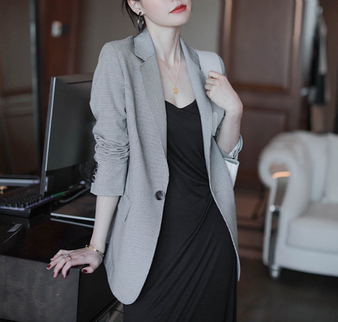 上品な千鳥格子柄が大人のきれいめスタイルを演出するテーラードジャケット。細かな柄がコーデに程よい華やかさを添え、シンプルなスタイリングでも印象的に仕上がります。コンパクトすぎないすっきりとしたシルエットで、骨格ウェーブさんでも重たく見えにくいデザイン。きちんと感のあるテーラードカラーが顔まわりを引き締め、上品な雰囲気を演出します。パンツにもスカートにも合わせやすく、通勤からお出かけまで幅広く活躍するジャケットです。