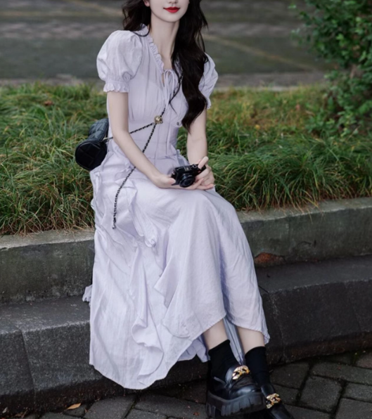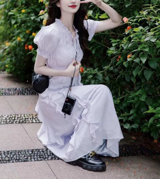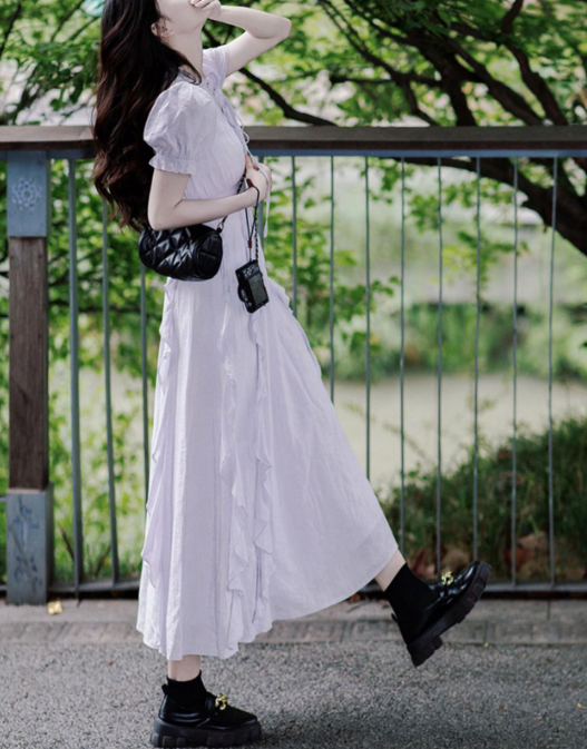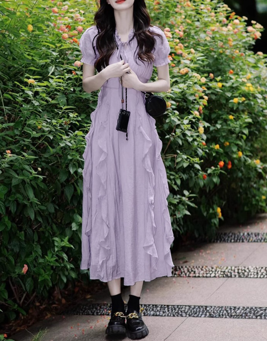 上半身がシンプルに見えやすい骨格ウェーブさんのバランスを整える、Vネックパフスリーブワンピース。首元をすっきり見せるVネックと、程よくボリュームのあるパフスリーブが上半身に自然な立体感をプラスします。縦に流れるフリルデザインが動きのあるシルエットを作り、重心が下がりやすいスタイルもバランスよく見せてくれる一枚。1枚で女性らしいコーデが完成する、大人のフェミニンワンピースです。